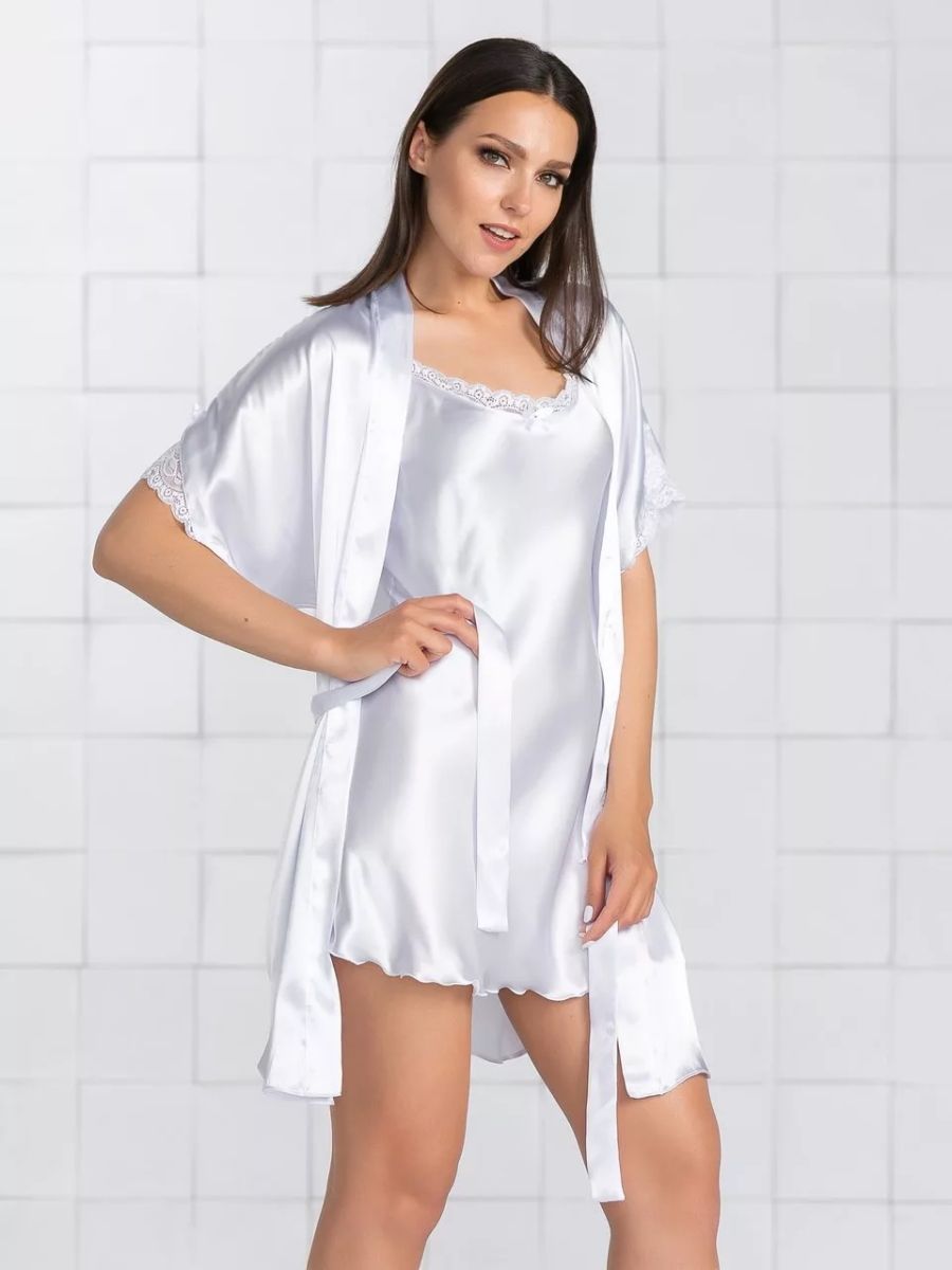 Короткий халат на запах из искусственного шелка, декорирован кружевом по рукаву.