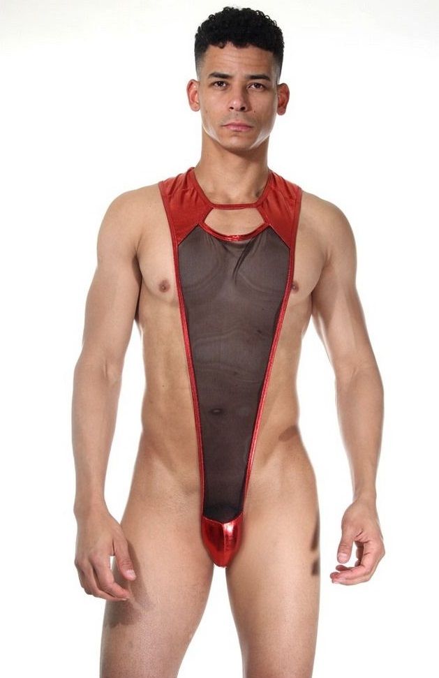 Интересное боди для мужчин, сшитое из двух видов ткани: черной полупрозрачной тонкой сетки и блестящего красного гладкого материала на плечах и в интимной зоне.