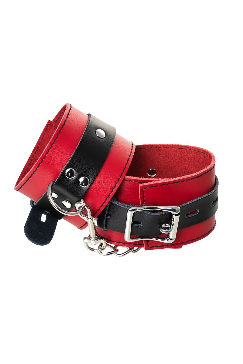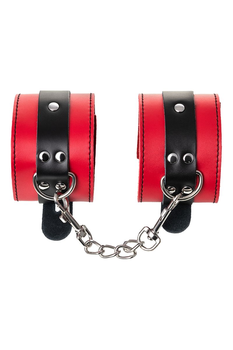 Оковы на ноги - волнующий воображение аксессуар, ведь это способ зафиксировать ноги партнера и получить полный доступ к его телу. Оковы из мягкой натуральной кожи сочетают в себе элементы, возбуждающие страсть и фантазию: красный и черный цвета и отделка металлическими элементами. В них будет комфортно подчиняться и ощущать ограничение свободы действий. Не натирают и имеют надежную степень фиксации. Размер легко регулируется металлической пряжкой. С помощью металлической цепочки и карабинов можно фиксировать ноги вместе, либо дополнить игру цепочкой и сковать ноги в широко разведенном положении. Длина манжет - 28 см., ширина - 6 см. Длина сцепки - 15,5 см.