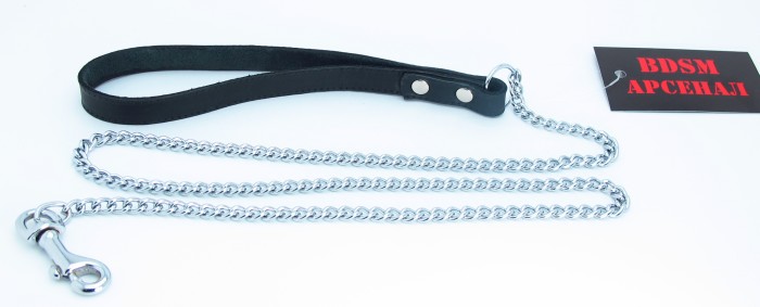 Поводок изготовлен из натуральной кожи. При изготовлении использована фурнитура с никелевым покрытием. Металлическая цепочка (поводок), с карабином на конце, поможет вам с лёгкостью управлять своим партнёром. Длина цепочки - 90 см., ширина - 0,8 см.