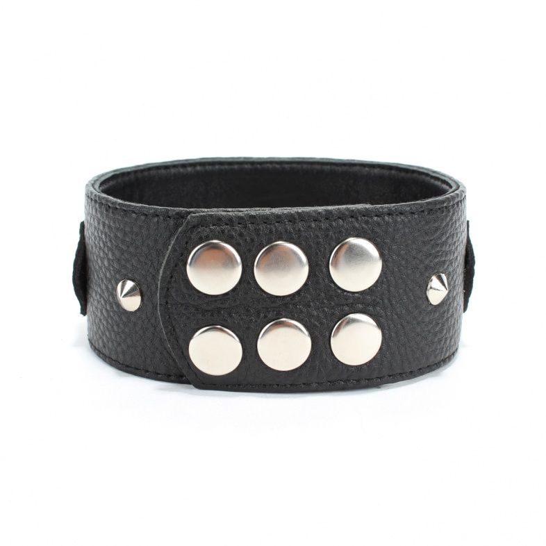 Черный кожаный ошейник с короткими шипами. Имеет три кольца для карабинов, три ряда заклепок-застежек. Размер регулируется. Ширина - 5,4 см.