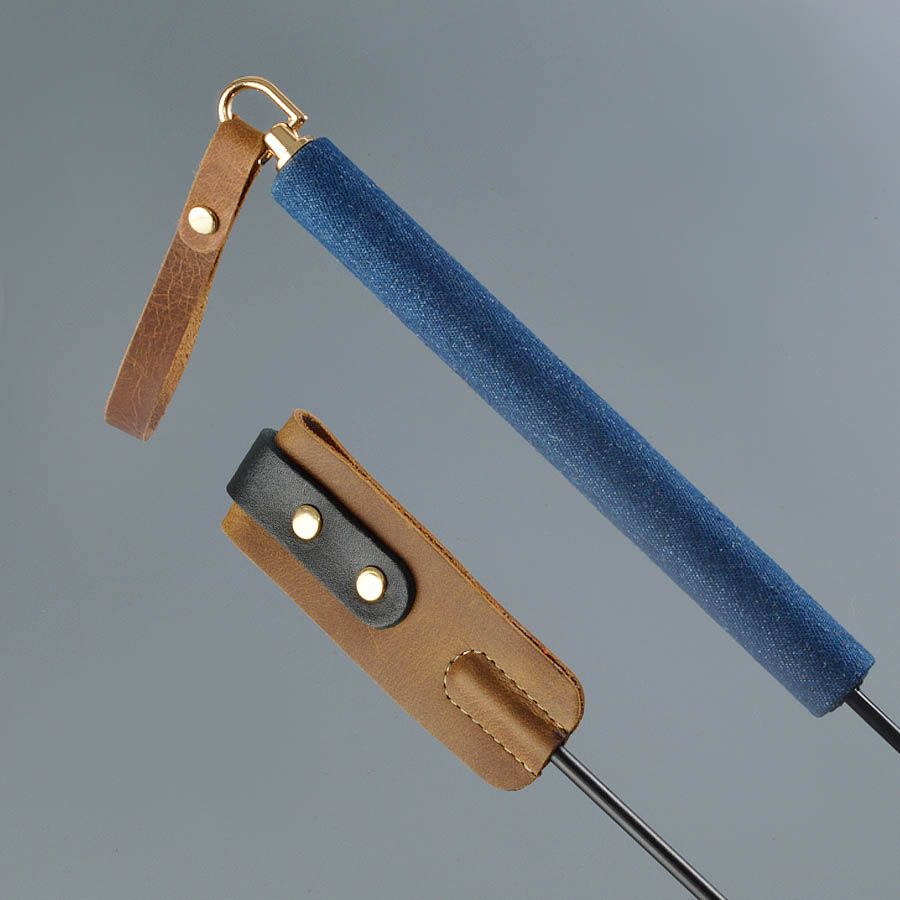 Хвостовая часть плети изготовлена из натуральной кожи, рукоять обтянута тканью джинс.